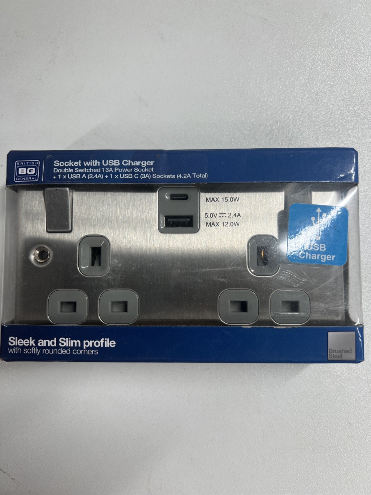 BG Brushed Steel Double Switch 13A Power Socket With 22W USB C + USB A Free Post