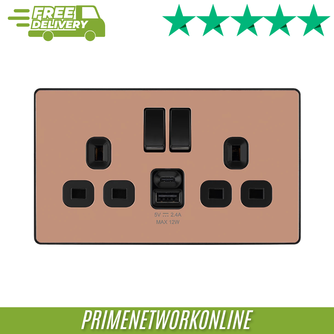 BG Polished Copper Double 13A Switched Socket with USB (Type A & C) ⭐⭐⭐⭐⭐