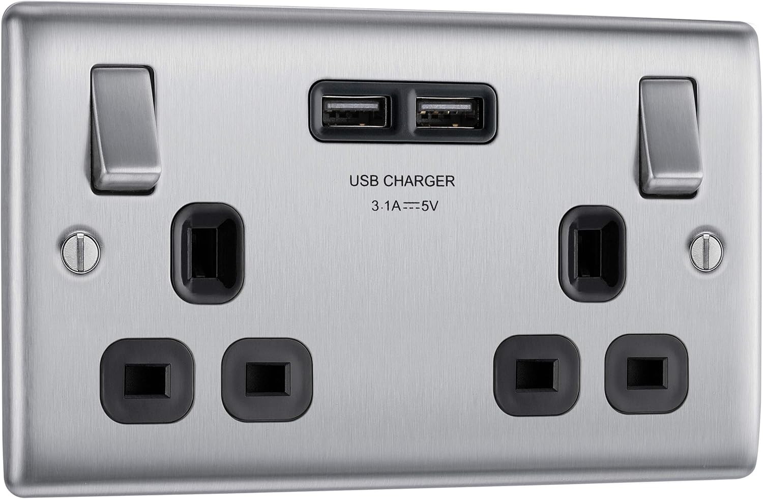 BG Brushed Steel Unswitched USB Double Socket 4 Ports NBS24U44B Black (2 x 2.1A)