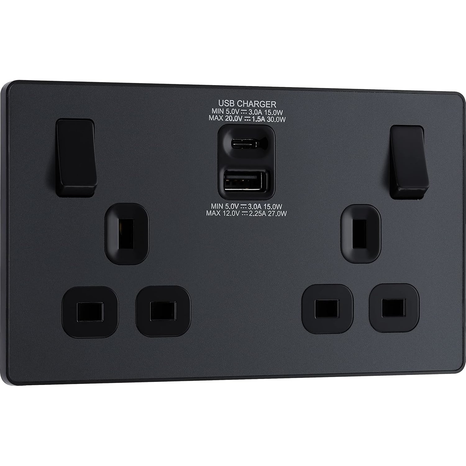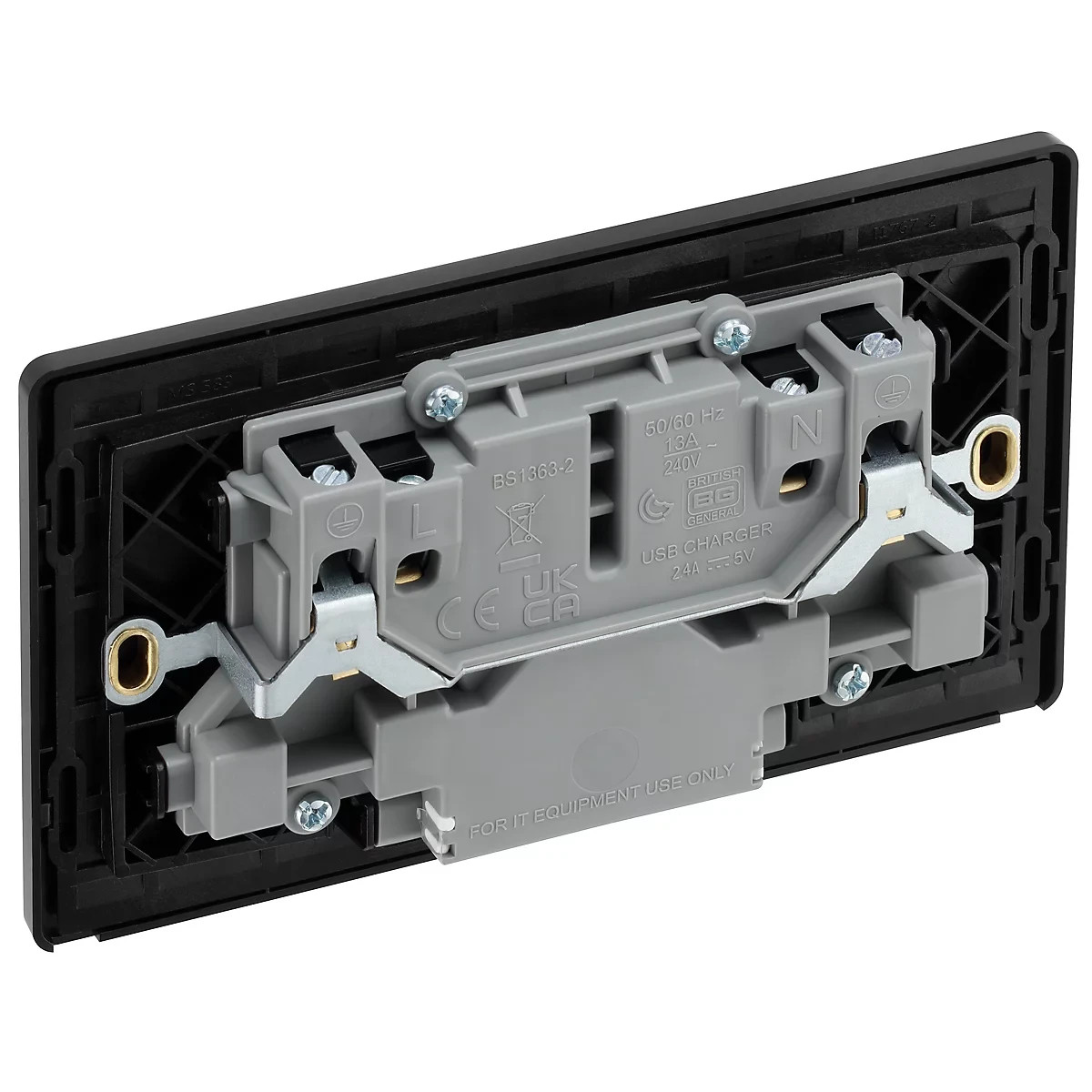 BG Matt Black Double Switched 13A Power Socket With 12W USB C + USB A