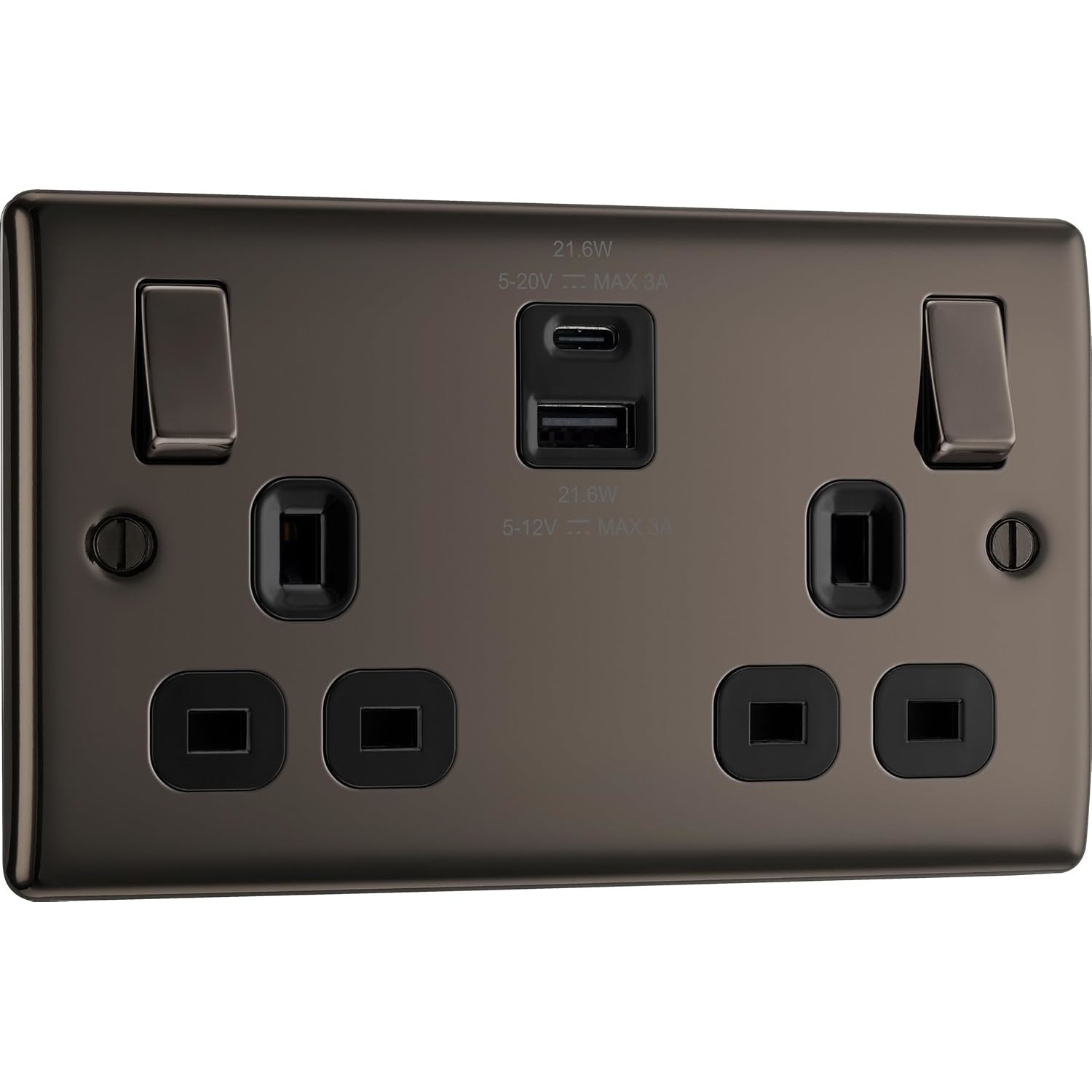 BG NBN22UAC22B Black Nickel Double Socket with USB 22W Type A & Type C USB