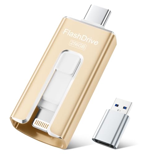SUDEHO USB Stick 256GB for iPhone, MFi Certified USB-C & Lightning Memory Stick, 3-in-1 USB 3.0 Flash Drive for iPhone/iPad/Android/PC, High-Speed Photo & Video Backup, Easy File Storage, Gold