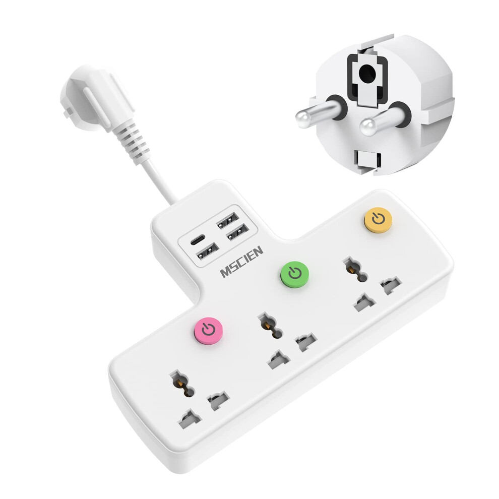 Travel Plug Extension, UK To EU Multi Plug with USB, 3 Way Individual Switched Sockets with USB C Extension Cord (10A/2500W)