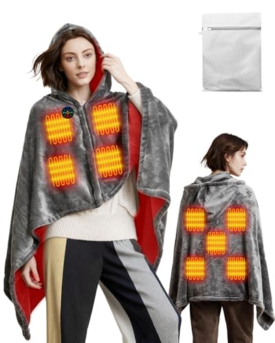 Olutula Electric Heated Blanket 150x80cm, with Power Bank 9 Heating Zone Heated Poncho with Detachable Hood and Zipper Front, USB Heated Blanket for Home Office Outdoor 3 Modes, Machine Washable