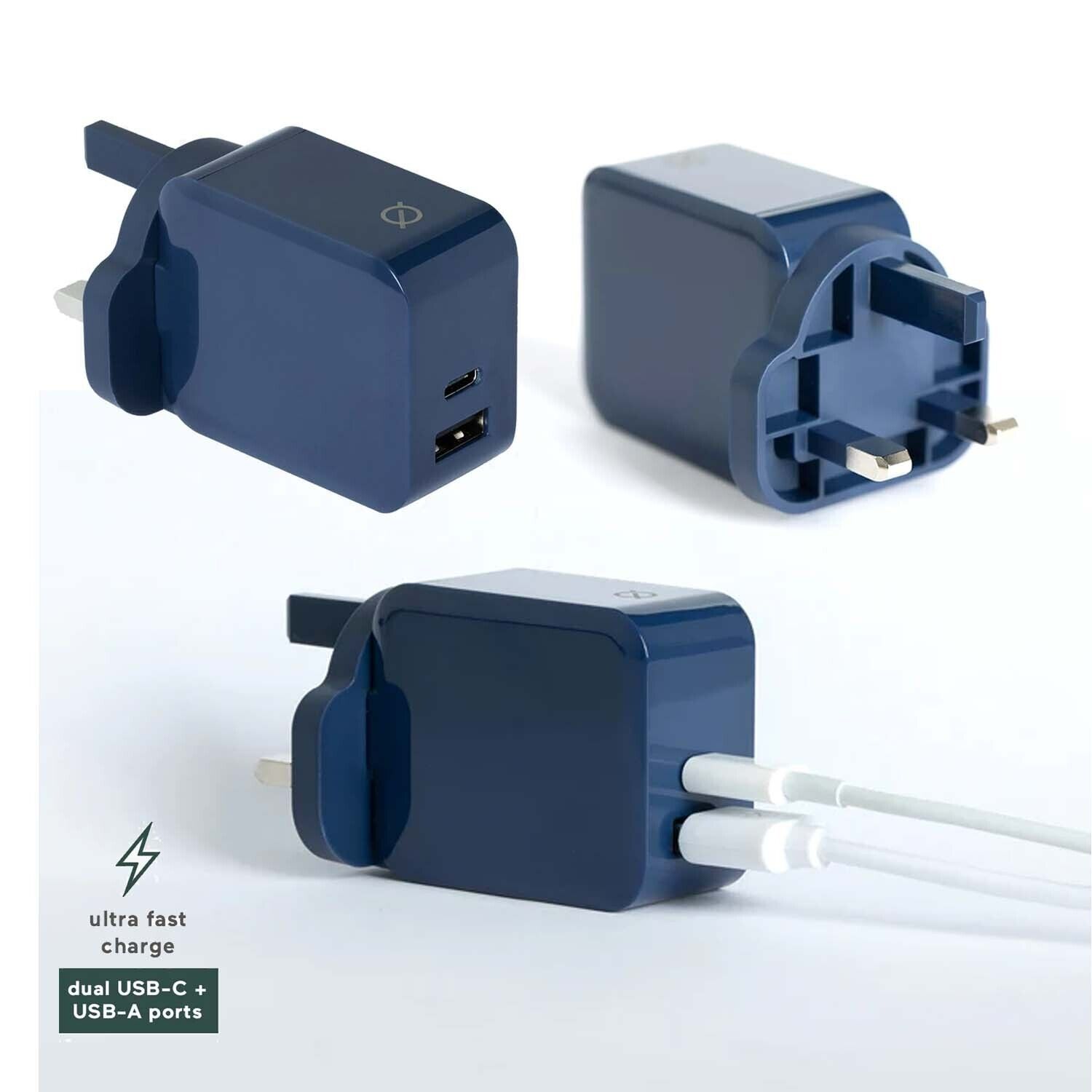 30W Charger Fast Adapter 3 Pin UK Mains Plug 2 Port USB C USB A By Atom Studios