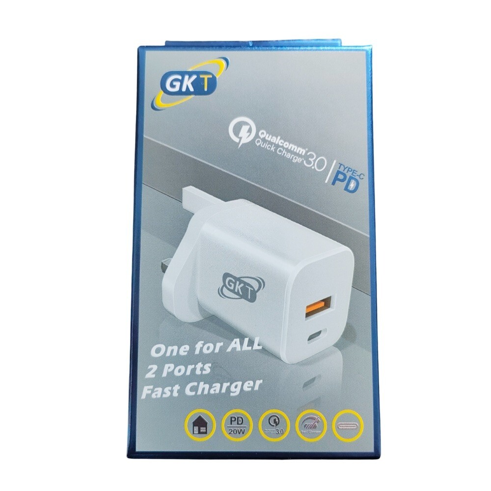 GK Telecom USB-C & USB QC 3.0 2 Port 20W Fast Charger Power Adapter Mains Plug