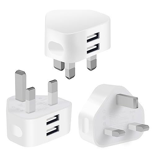 Pack of 3 Dual Port USB Plug UK Adapter Compact Mains Charge 2.1A with Smart IC Charging Technology for iPhone 11 Xs/XS Max/XR/X/8/7/6/Plus,iPad Pro/Air 2/Mini 4 etc