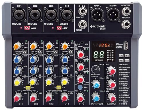 Citronic | CMA-8 Series Compact Mixer Audio Mixing Console: 99 Adjustable Digital Effects, Bluetooth Receiver, USB mp3 Audio Player/Recorder & More | 4 Mono + 2 Stereo