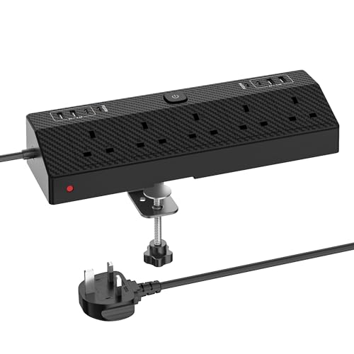 Desk Extension Lead 1.8M, HAFINO 2 PD 20W Desk Power Socket with USB C Fast Charger, 5 Way Desk Power Strip with 8 USB Slot, Desktop Plug Socket with Removable Clamp for Home Office Accessories, Black