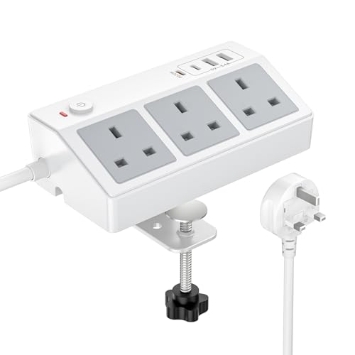 Desk Extension Lead with USB C Slots, PASSUS PD 20W Fast Charging Power Station, 2M Desk Power Socket 3 Way Power Socket with 4 USB Slots, Desktop Plug Socket with Removable Clamp for Home Office