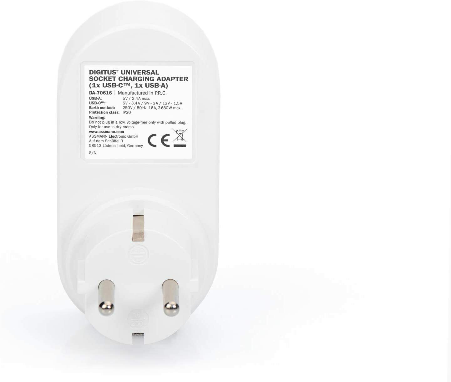 DIGITUS Universal USB-C plug-in charger with USB integrated socket 2 pin travel