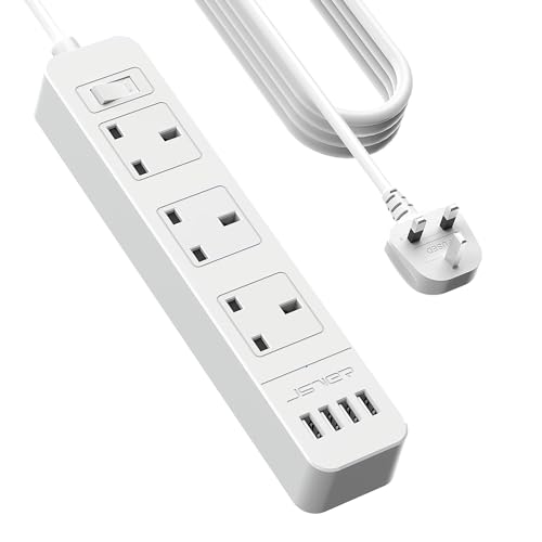 JSVER Extension Lead USB, Power Socket with 3 Outlet 4 USB Charging Station Power Strip USB with 2m Power Lead-White
