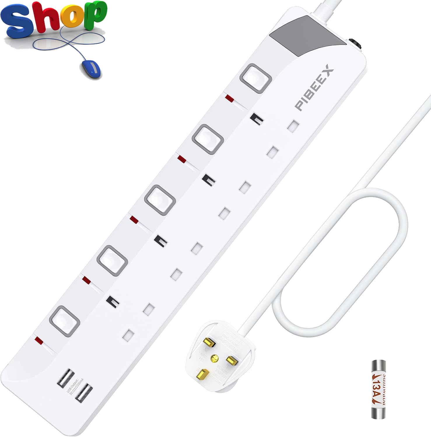 Mscien 2m Extension Lead with USB Slots, 4 Way 3 USB Extension Socket with 2 Metre Extension Cords, UK Extension Cable Wall Mount, 4 Gang Power Strip with Switch Multiplug Socket