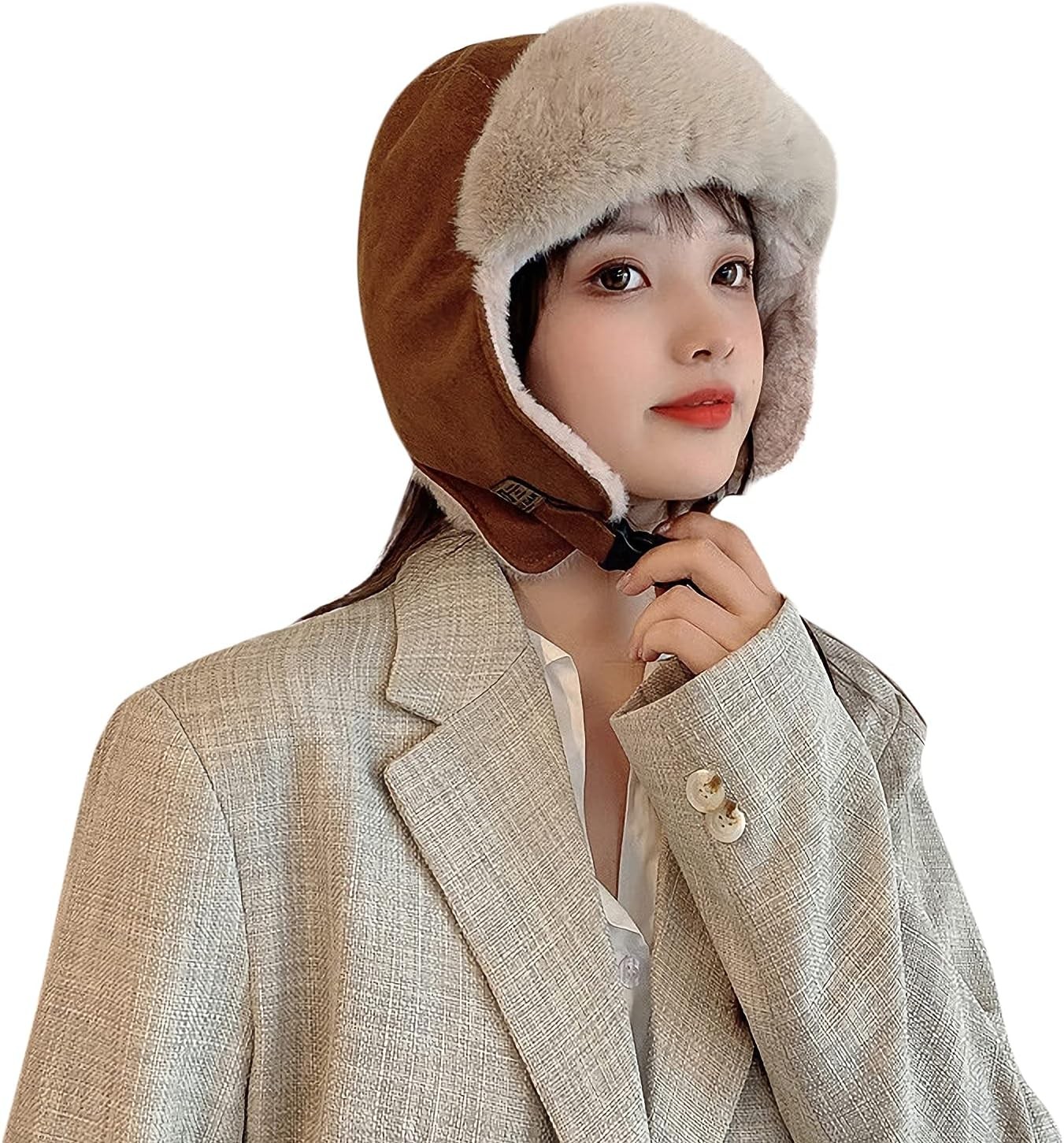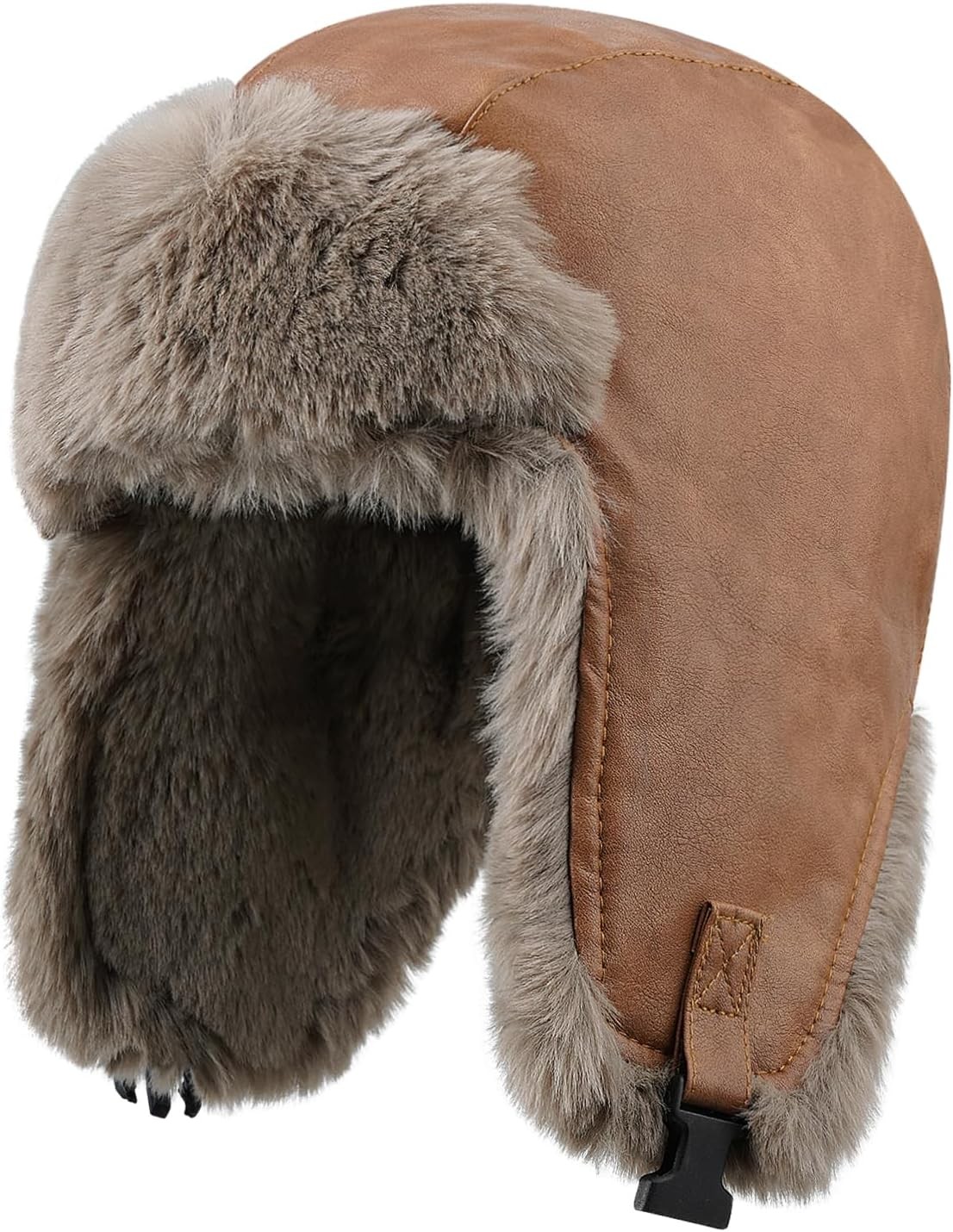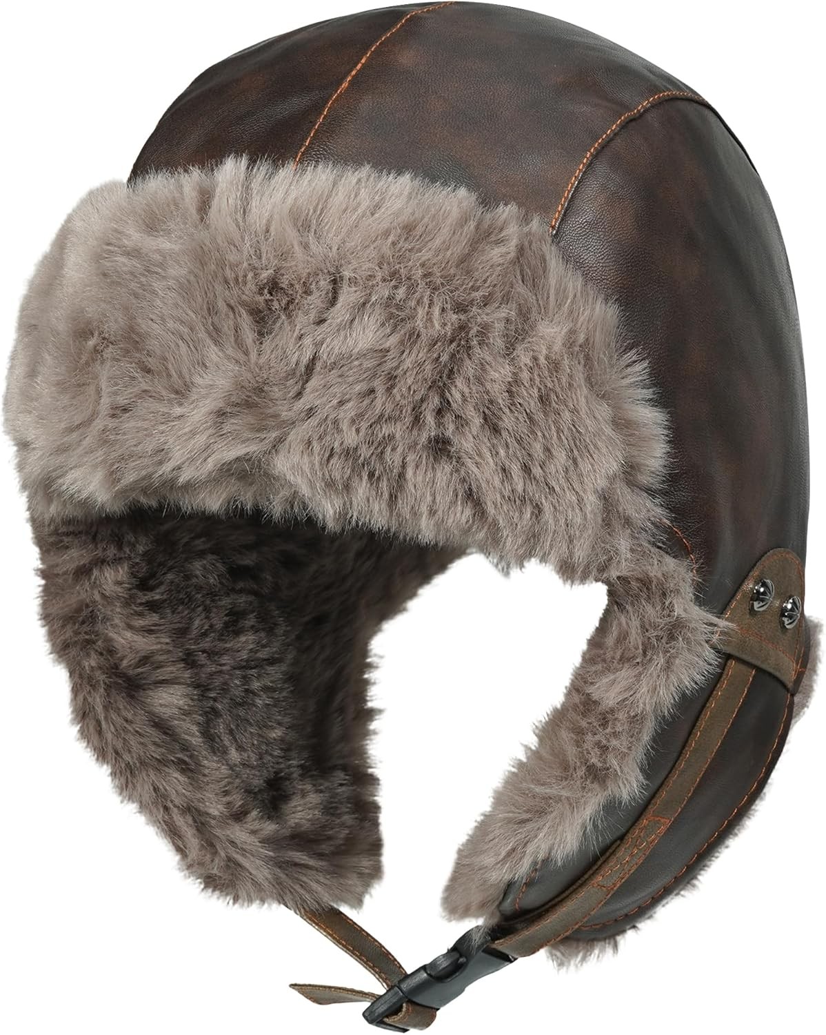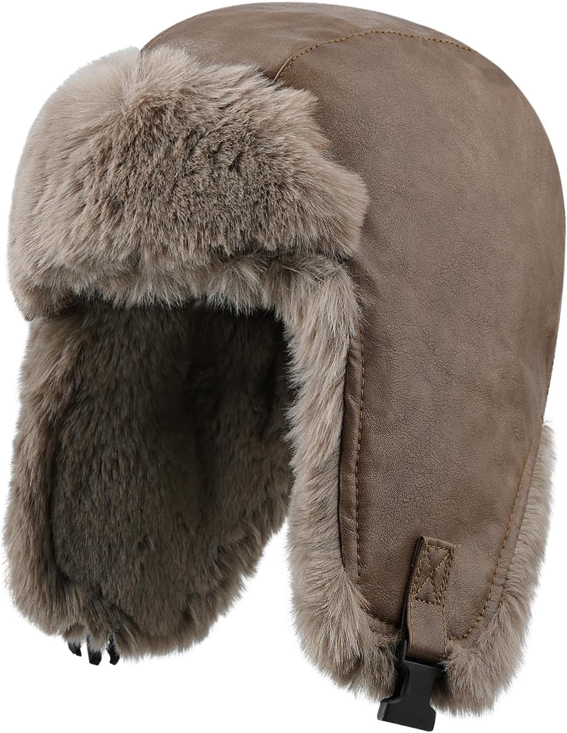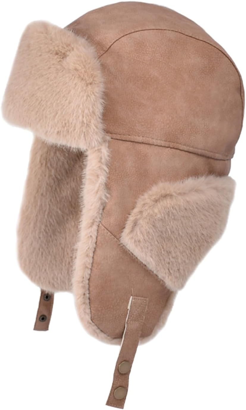 Tingyilan Brown,Russian Soviet Ushanka Cossack Aviator Bomber Hat Winter Fur Earflap Cap, Faux Fur & Faux PU Leather Trapper Hat Windproof Hunting Ski