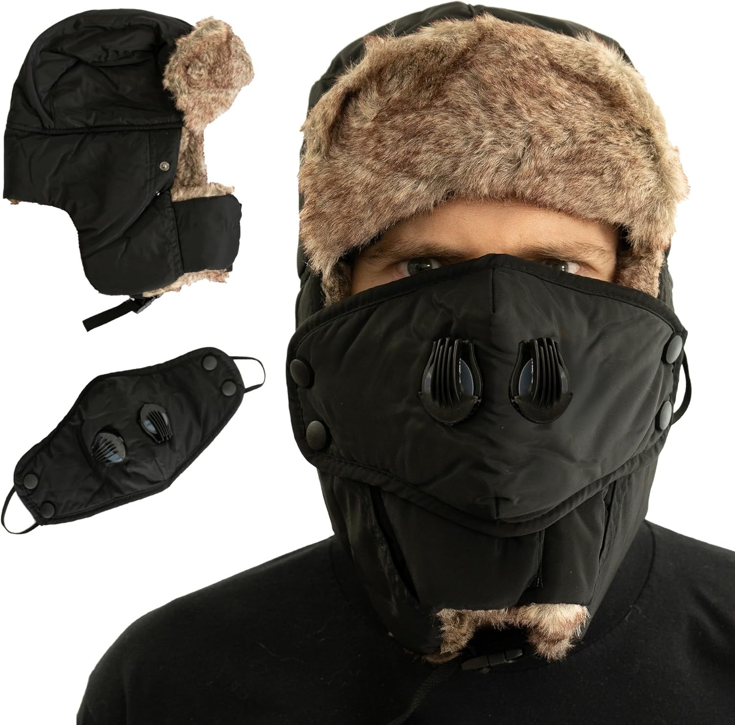 Zouwel Mens Hats and Caps, Ushanka Hat with Ear Flaps and Mask, Faux Fur Winter Warmer Windproof Bomber Hat for Skating, Skiing or Daily Use, Winter Hats for Men Women Black