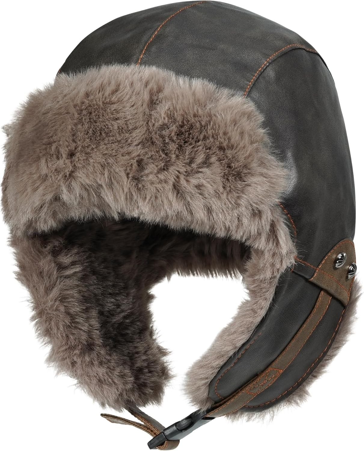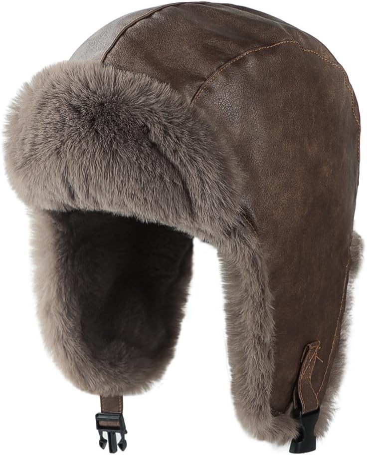 BSYLOO Winter Aviator Hat with Ear Flaps and Leather Windproof Fluffy Russian Ushanka Trapper Hat for Men and Women Dark Brown