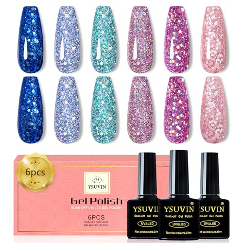 Yueshop Glitter Gel Nail Polish Set - 6 Pcs 8ml Purple Pink Blue Green Sparkle Silver Glitter Nail Polish Soak Off UV Gel Nails Lamp Varnish Manicure Kit For Beauty