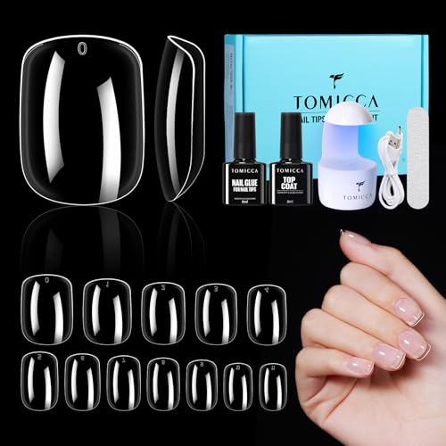 TOMICCA Nail Tips and Glue Gel Kit, Nail Extension Kit 4 In 1 Nail Glue & Top Coat, Extra Short Square Soft Nails Tip and UV LED Nail Lamp, Acrylic Nail Kit for DIY Manicure
