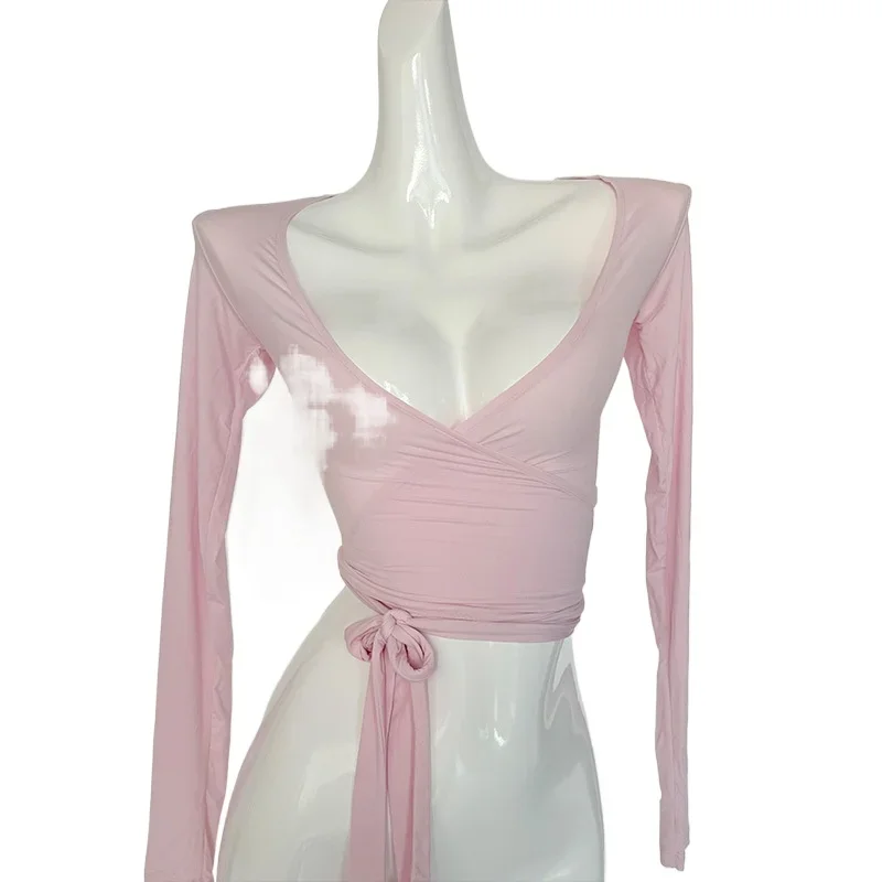 LYSINK Women’s Cross Wrap Tie Tops Long Sleeve Deep V Neck Solid Color Slim Fit T-Shirts Yoga Pilates Ballet Workout Tops (Ba Pink, S)