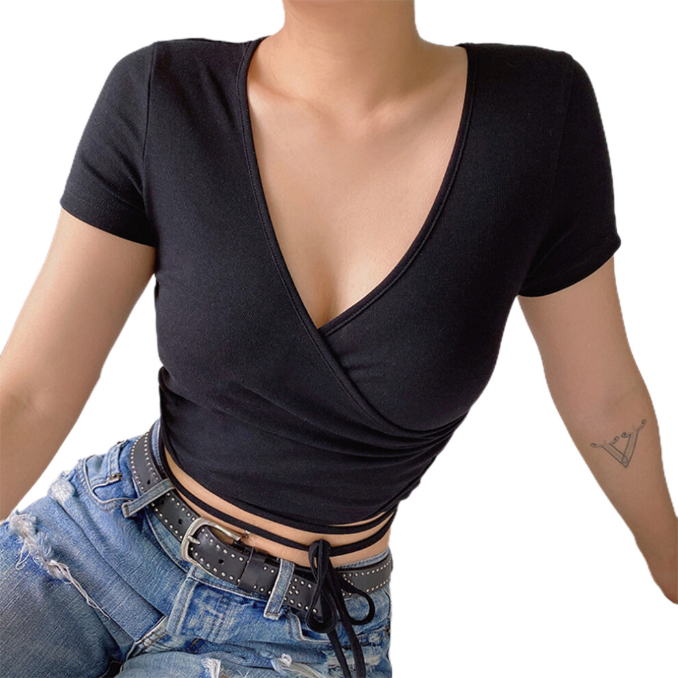 Short Sleeve Crop Top Women's Deep V Neck Cross Wrap Stretchy Fabric Sexy Slim Fit Ruched Waist Flattering Design Soft Ruching Casual Outings