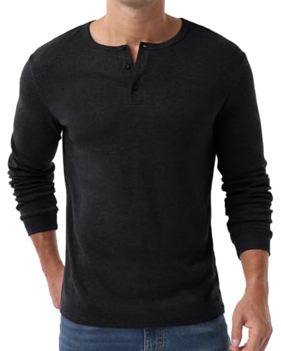 PrinStory Mens T Shirt Henley Long Sleeve Pullover Slim Fit T-Shirt V Neck Jumper Top with Button (Black, S)