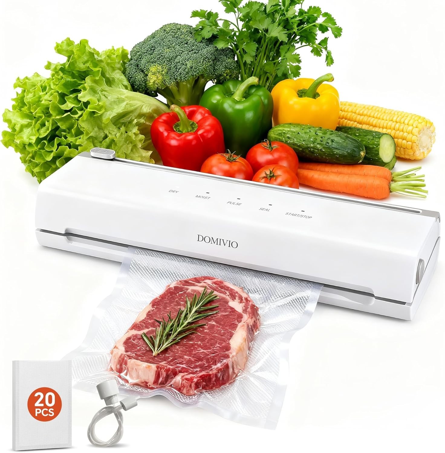 6-in-1 Vacuum Sealer Machine, 65kPa Fast-Compact Vac Pack Machine with 20 Vacuum Seal Bags, Built-in Cutter & Accessory Hose for Sous Vide Cooking, Dry & Moist Food Preservation