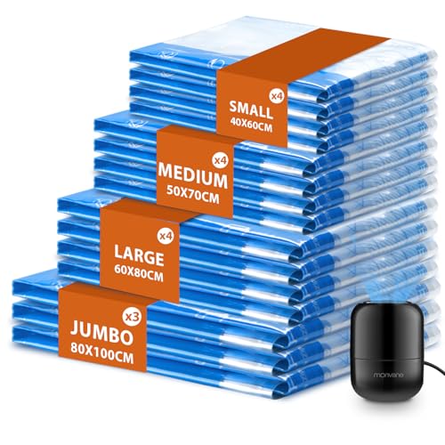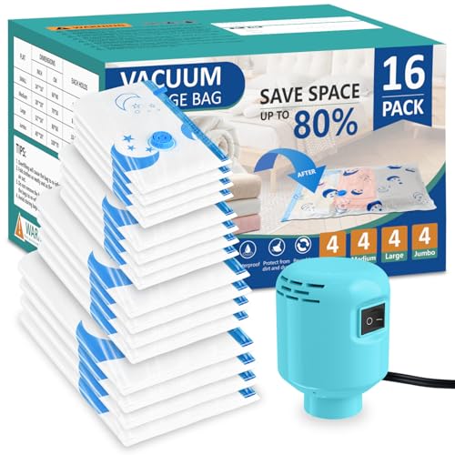 SZO Vacuum Storage Bags for Clothes with Electric Pump, 16-Pack(4 Jumbo, 4 Large, 4 Medium, 4 Small), Vacuum Bags for Duvets, Mattresses, Blankets, Pillows, Bedding, Travel, Moving, Space Saver