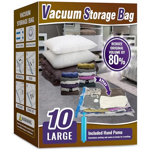 Oumaru Vacuum Storage Bags for Clothes, 10 Pack Vacuum Bags, Space Saver Bags for Clothes, Duvets and Pillows, Hand Pump Included (Large)