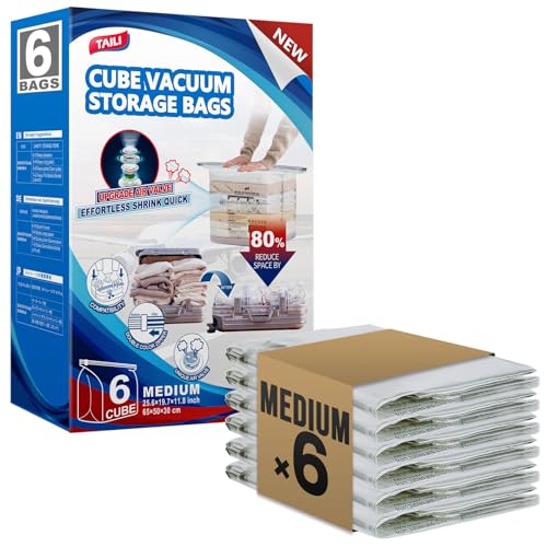 TAILI Cube Travel Vacuum Storage Bags 6 Pack, Medium Size (25x19x11 inch), Reusable Vacuum Bags for Clothes Travel Luggage Space Saver and Suitcases