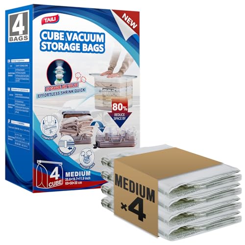 TAILI Cube Travel Vacuum Storage Bags 4 Pack, Medium Size (25x19x11 inch), Reusable Vacuum Bags for Clothes Travel Suitcases and Luggage Space Save