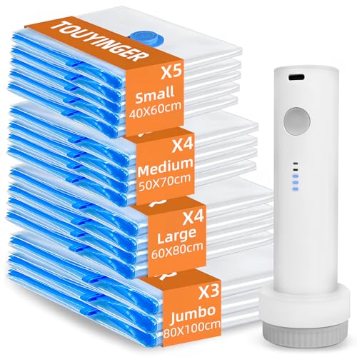 TOUYINGER Vacuum Storage Bags for Clothes, 16 Pack Travel Vacuum Bags with Wireless Pump, Reusable Space Saver Bags for for Travel and Home