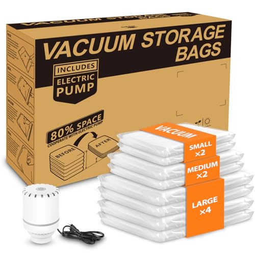 SZO Vacuum Storage Bags for Clothes with Electric Pump, 8-Pack(4 Jumbo, 4 Large), Vacuum Bags for Duvets, Mattresses, Blankets, Comforters, Pillows, Bedding, Travel, Moving, Space Saver Bags 80%
