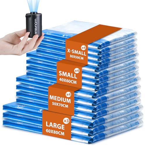 Vacuum Compression Storage Bags for Clothes - 12 Pack Reusable Space Saver Bags for travel (3*L + 3*M + 3*S + 3*XS)