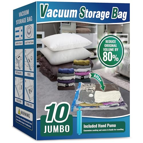 Oumaru Vacuum Storage Bags for Clothes, 10 Pack Vacuum Bags, Space Saver Bags for Clothes, Duvets and Pillows, Hand Pump Included (Jumbo)