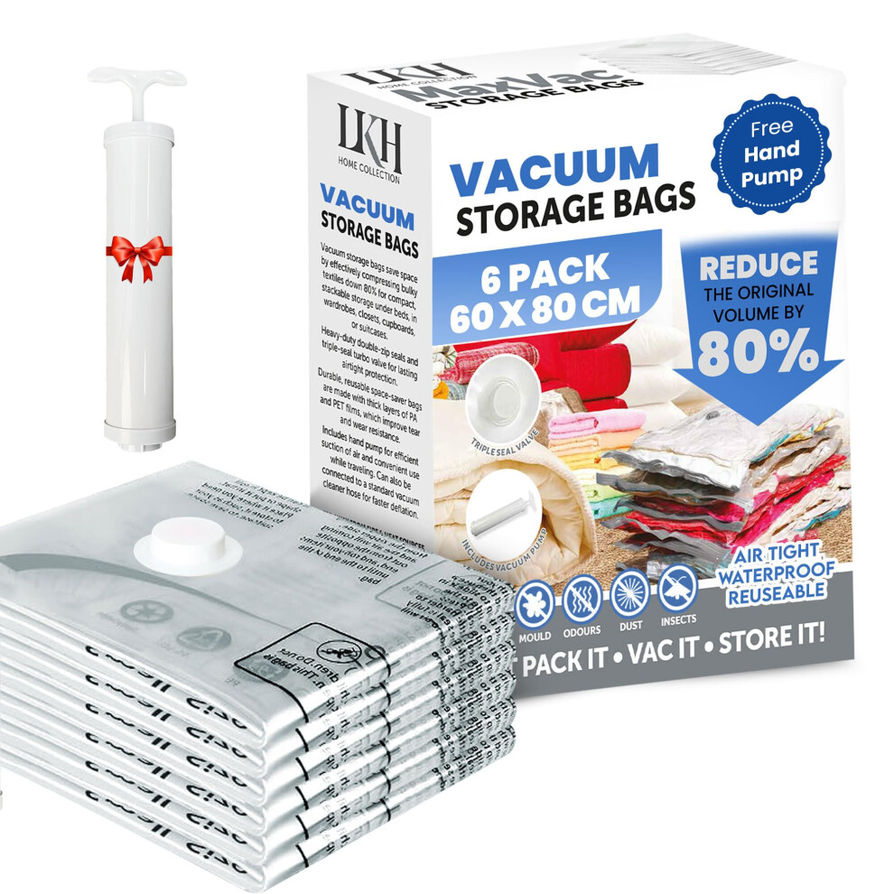 (60 x 80 cm) LKH Vacuum Seal Bags for Clothing Travel with Pump Pack of 6 Waterproof Airtight Reusable Space Saver Vacuum Storage Bags Multi Size