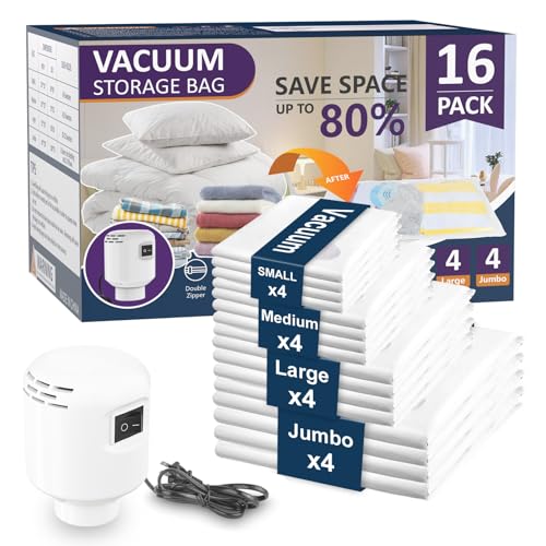 16 Pack Vacuum Storage Bags with Electric Air Pump, 4 jumbo, 4 large, 4 Medium, 4 Small Travel Clothes Space Saver Bags, Compression Airtight Seal Bags for Clothes, Pillows, Comforters, Blankets