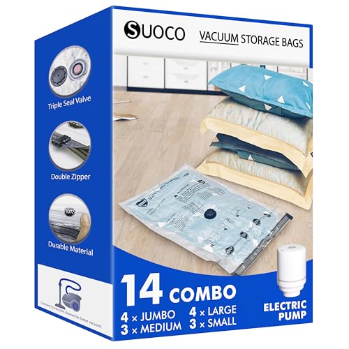 SUOCO 14 Combo Vacuum Storage Bags with Electric Pump, (4 Jumbo, 4 Large, 3 Medium, 3 Small) Travel Clothes Space Saver Bags, Compression Airtight Seal Bags for Clothing, Pillows, Comforters, Blankets