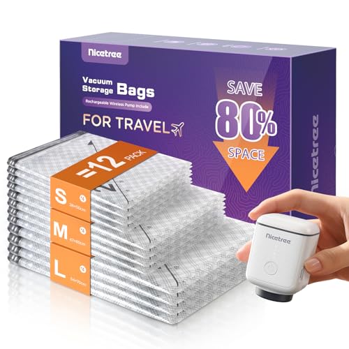 Innsky Nicetree 12-Pack Vacuum Storage Bags with Rechargeable Wireless Pump, 3 Sizes (20/24/28 Inch) Travel Moving Vacuum Storage Bags for Clothes, Duvets & Seasonal Storage Space Saver for Luggage