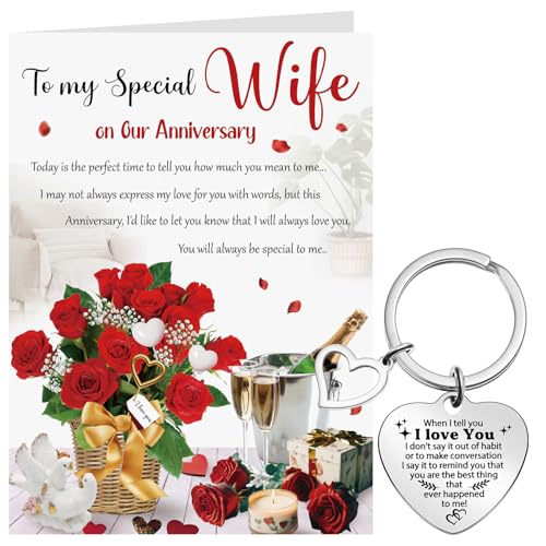 Faccito Anniversary Wife Gifts from Husband Wedding Anniversary Card Hearts and Roses Greeting Card with White Envelope Keyring Keychain for Valentine Wife Her Present
