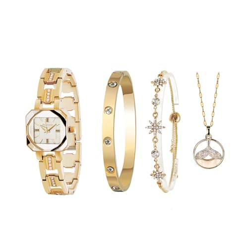 TIME100 Women's Watch Bracelet Set, Elegant Gold Bracelet Watch with 2 Adjustable Crystal Bracelets & Pearl Pendant Necklace, Birthday/Christmas/Valentine's Day Gift Box Watches for Women