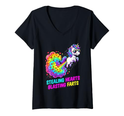 Women's Funny Unicorn Fart Valentine Stealing Hearts Blasting Farts V-Neck T-Shirt