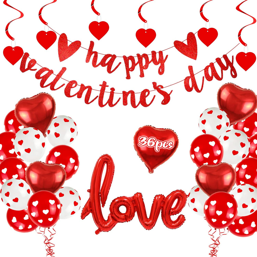 Valentine's Day Balloons Decorations Kit Heart Shaped Balloons I Love You Balloons with Banner Swirl Hanging for Decorations Party Supplies-36 Pack