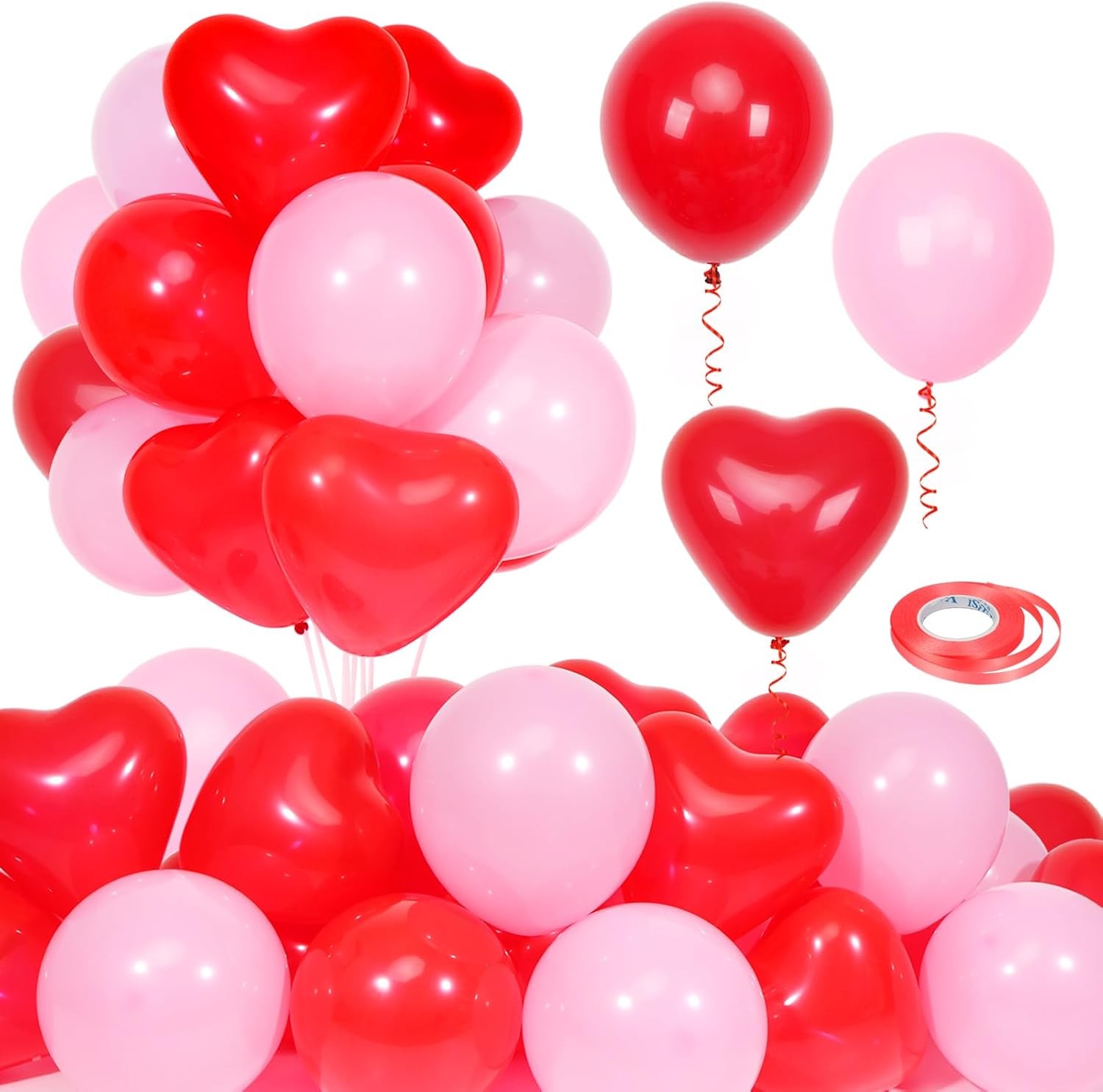 60Pcs Pink and Red Heart Shaped Balloons, Red Valentine's Day Balloons Set with