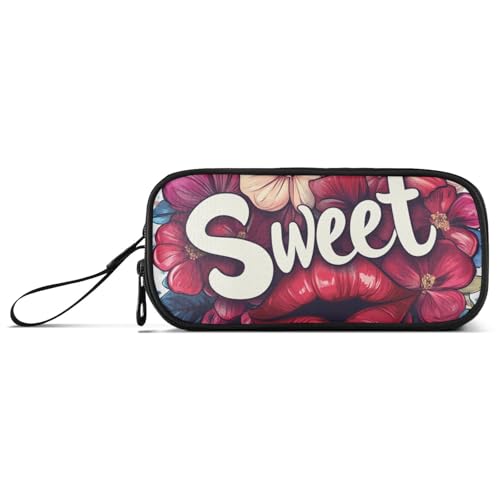Valentines Day Flowers Red Lips Sweet Nylon Pencil Bags with Zipper Large Capacity Pencil Case Stationery for Office Men