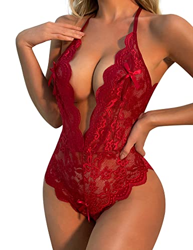 ROSVAJFY Women's Lace Bodysuit Sexy Lingerie One Piece Teddy Underwear Deep V Transparent Bodysuit Halter Leotard Naughty Sleepwear Backless Negligee for Valentine’s Day (Red1)
