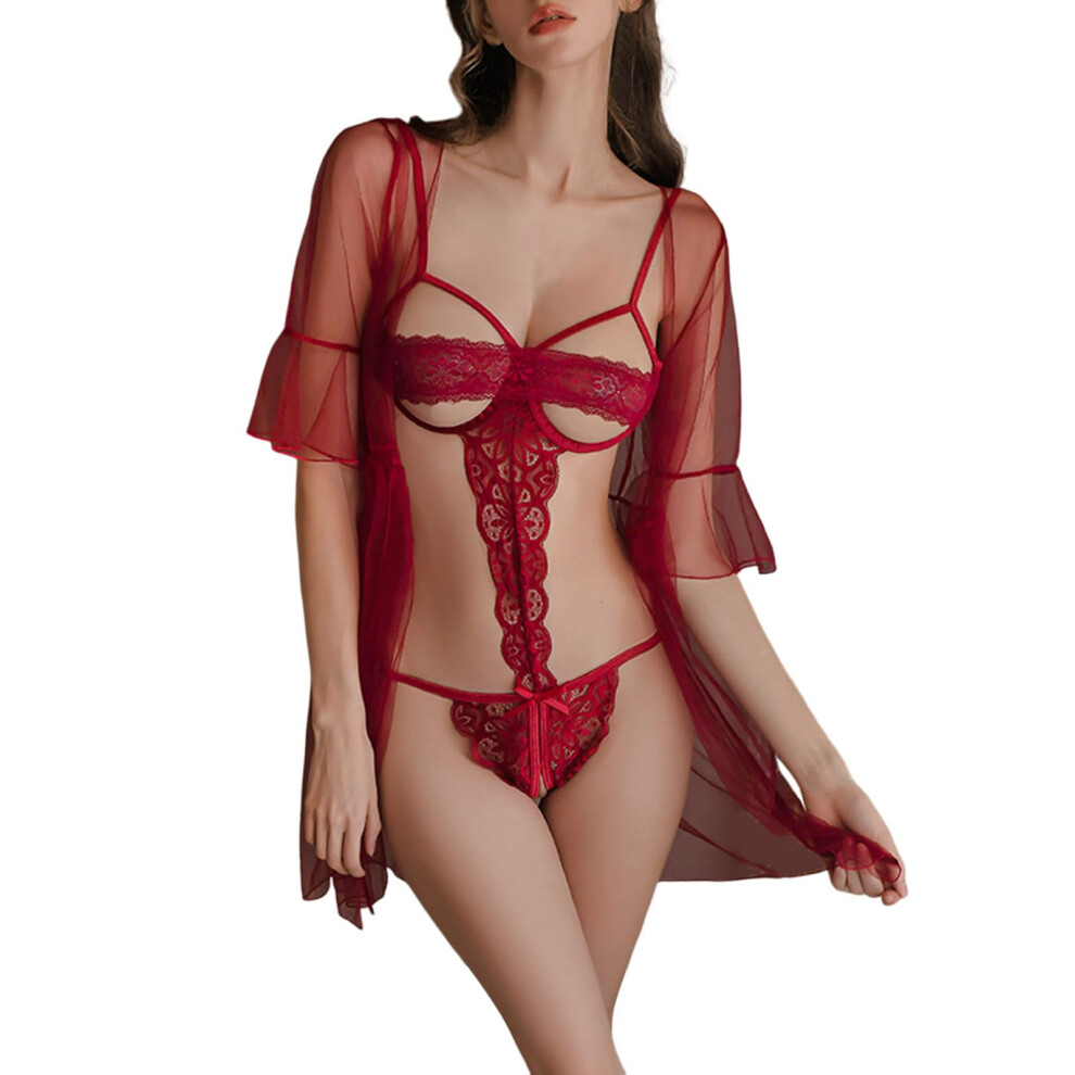 Women's Lingerie Dress Set 2025 Valentine's Day Sexy Lace Lingerie Nightwear Underwear Robe Sleepwear Dress Burgundy