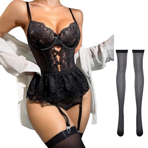 ROSVAJFY Women’s Sexy Lace Teddy Lingerie Set with Suspender Belt + Stockings Push Up Underwire Bodysuit Sheer Mesh Babydoll Cutout Back Strappy Corset Nightwear Bridal Valentine’s Day (Black, L)