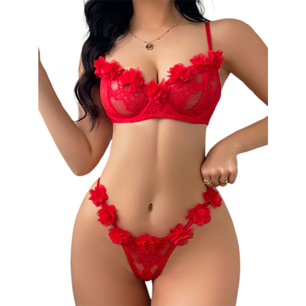(M, Red) Women 2 Pieces Valentine's Day Lingerie Nightwear Set, Lace Flower Sleeveless Bra Low Waist Thong Sleepwear Suit