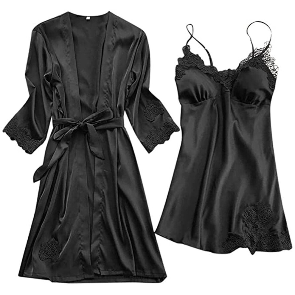 Women's Lingerie Dress Set 2025 Valentine's Day Lingerie Silk Lace Robe Dress Nightdress Sleepwear Kimono Set Black