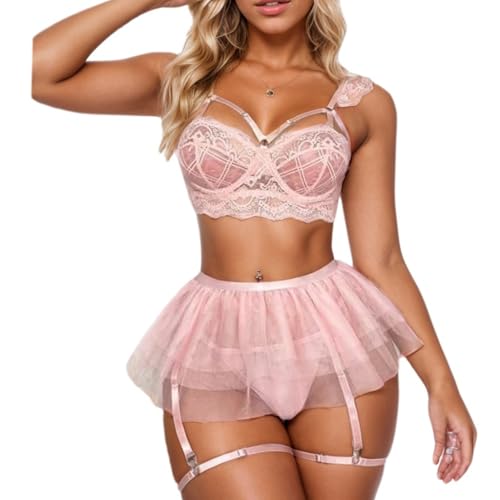 Sexy Lingerie for Women Sets Lace Mesh Suspenders Babydoll Underwear Transparent Tulle Bra with Bow High Waist Crotchless Knickers Pyjamas Outfits for Ladies Carnival Valentines Day (Black, L)